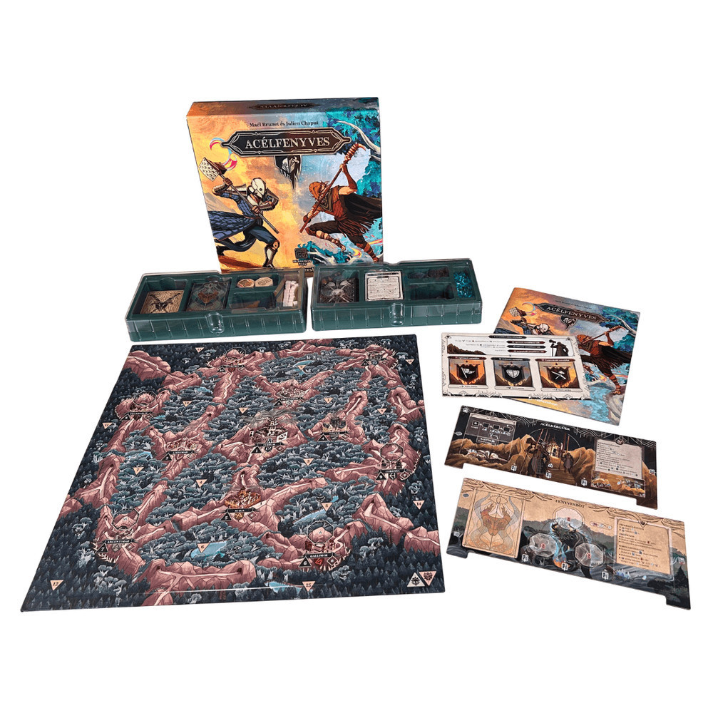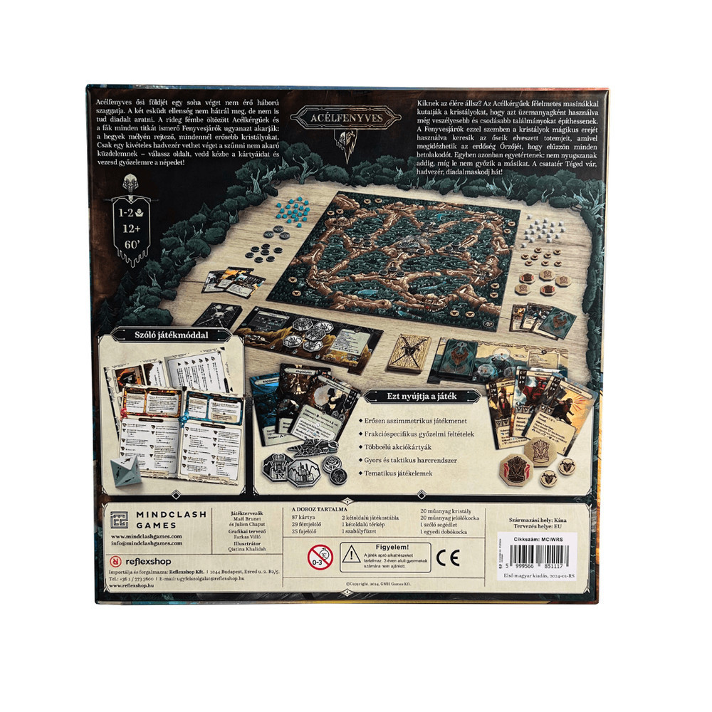 Csatlakozz egy végtelen küzdelemhez Acélfenyves titokzatos világában, ahol két frakció száll szembe egymással. Az acélkérgűek, a vashegyek mesterei, mérnöki csodáik számára próbálják kivonni a kristályok esszenciáját. Másfelől a fenyvesjárók azokkal a mágikus totemekkel kívánják megidézni az Őrzőt, hogy végleg visszaszerezzék földjüket. Ez az erősen aszimmetrikus, kártyavezérelt taktikai játék minden fordulóban szoros döntések elé állít. A játékosok különböző akciók közül választhatnak: seregeket mozgathatnak, csatákat vívhatnak, kristályokat nyerhetnek ki és titkos rituálék nyomába eredhetnek. A győzelemhez az acélkérgűeknek három kohó felépítésére, a fenyvesjáróknak pedig három totem biztonságba helyezésére van szükségük. A doboz tartalma: közös játékelemek, mint egy térkép és 20 kristály; szóló játékelemek, például varázskocka és 50 erőkártya; valamint egyedi frakcióelemek. Játékosok száma: 2 fő. Játékidő: 60 perc. Ajánlott kor: 12 év felett.