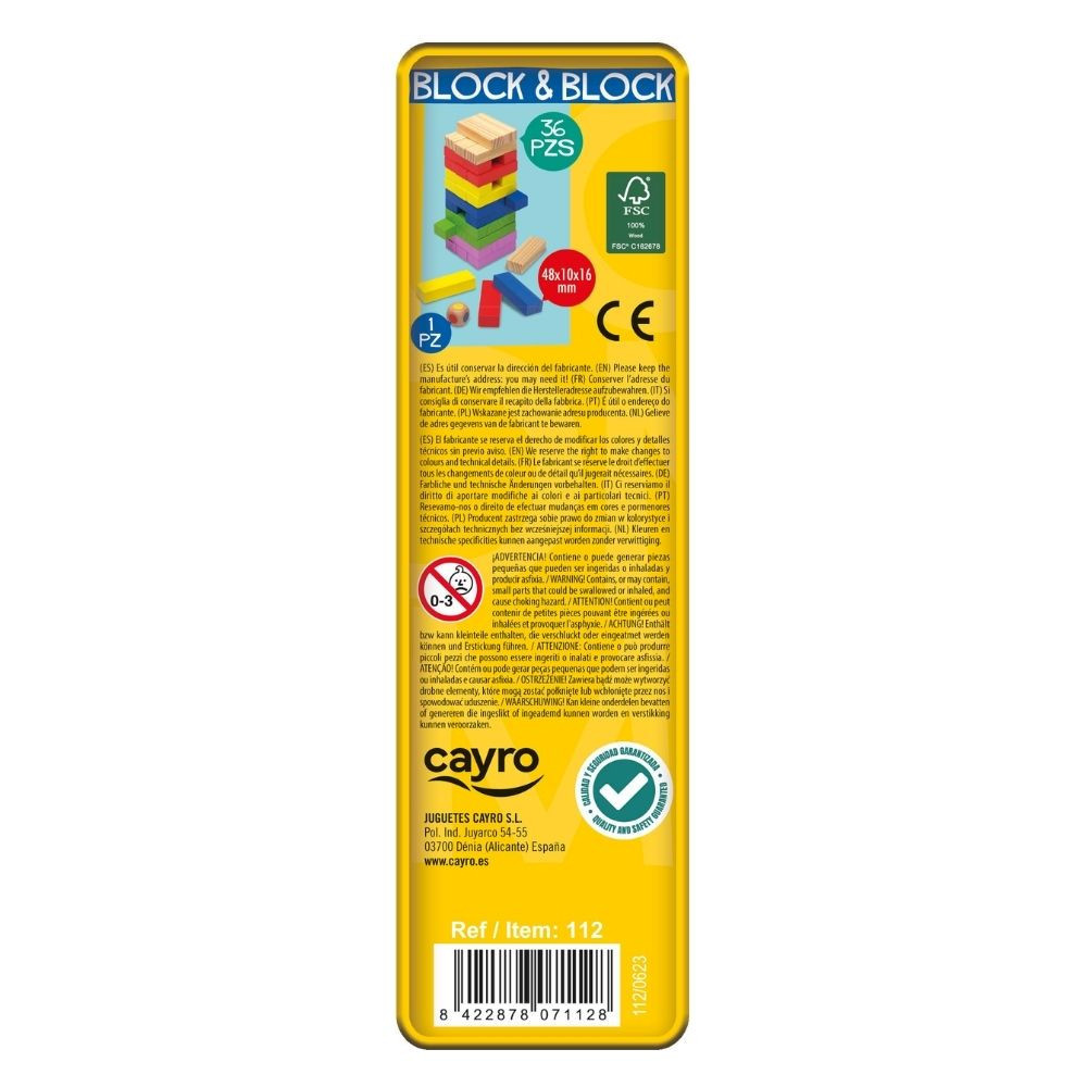A Block & Block színes faelemeivel tartósan egyensúlyban kell tartani a tornyot. A játékosok felváltva emelnek ki egy blokkot, majd helyezik azt a torony tetejére. Aki miatta eldől a szerkezet, veszít. A feszültség körönként nő, hiszen egy rossz mozdulat ledöntheti a tornyot. A játék nyelve angol, de nyelvfüggetlen a színes elemek és egyszerű szabályok révén. Doboz tartalma: