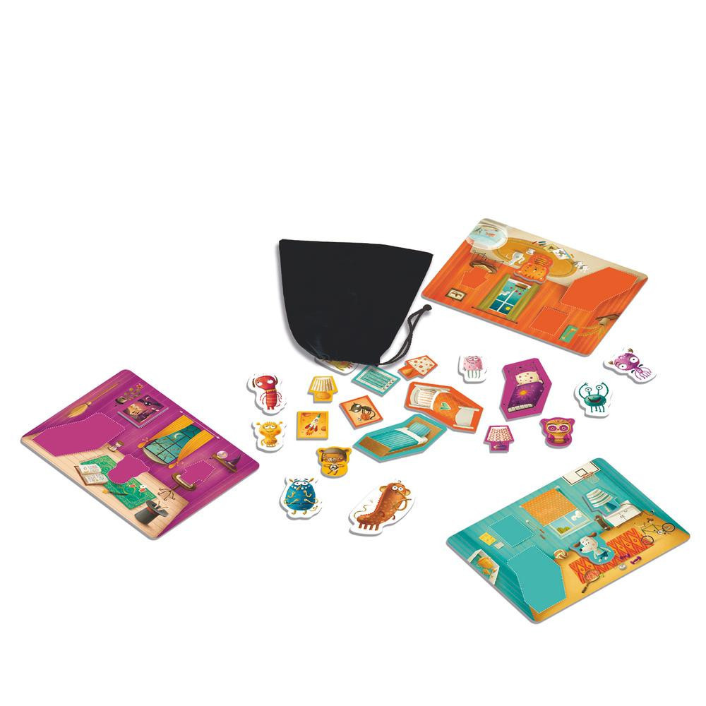 A játékosok a tárgyakat egy speciális húzózsákból húzzák ki, majd tapintás segítségével próbálják meg felismerni és a megfelelő helyekre tenni őket a saját táblájukon. Ügyelj a szörnyekre, mert ezek miatt a gyerekek nem tudnak elaludni félősen! A győztes az, aki először valósítja meg a rendet a szobájában.