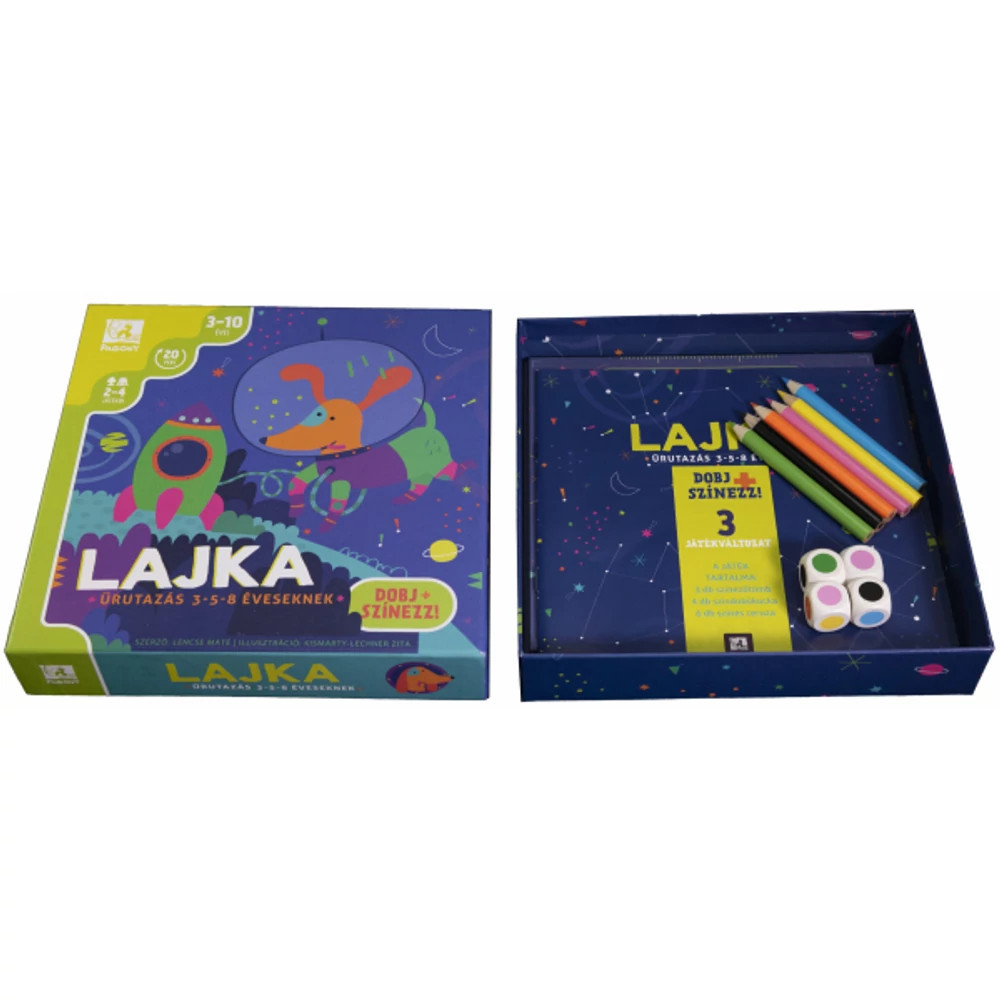 Utazz Lajkával! Tarts Lajkával űrfelfedező körútján! Különös űrlényekkel találkozik, űrkukacokat gyűjt, és megkóstolja az űrkutyaeledelt is. Segítsetek barátaiddal Lajkának: dobjatok a színes kockákkal, majd színezzétek ki az űrkukacokat, kutyajátékokat és az űrállatokat. A játékot három változatban lehet játszani.