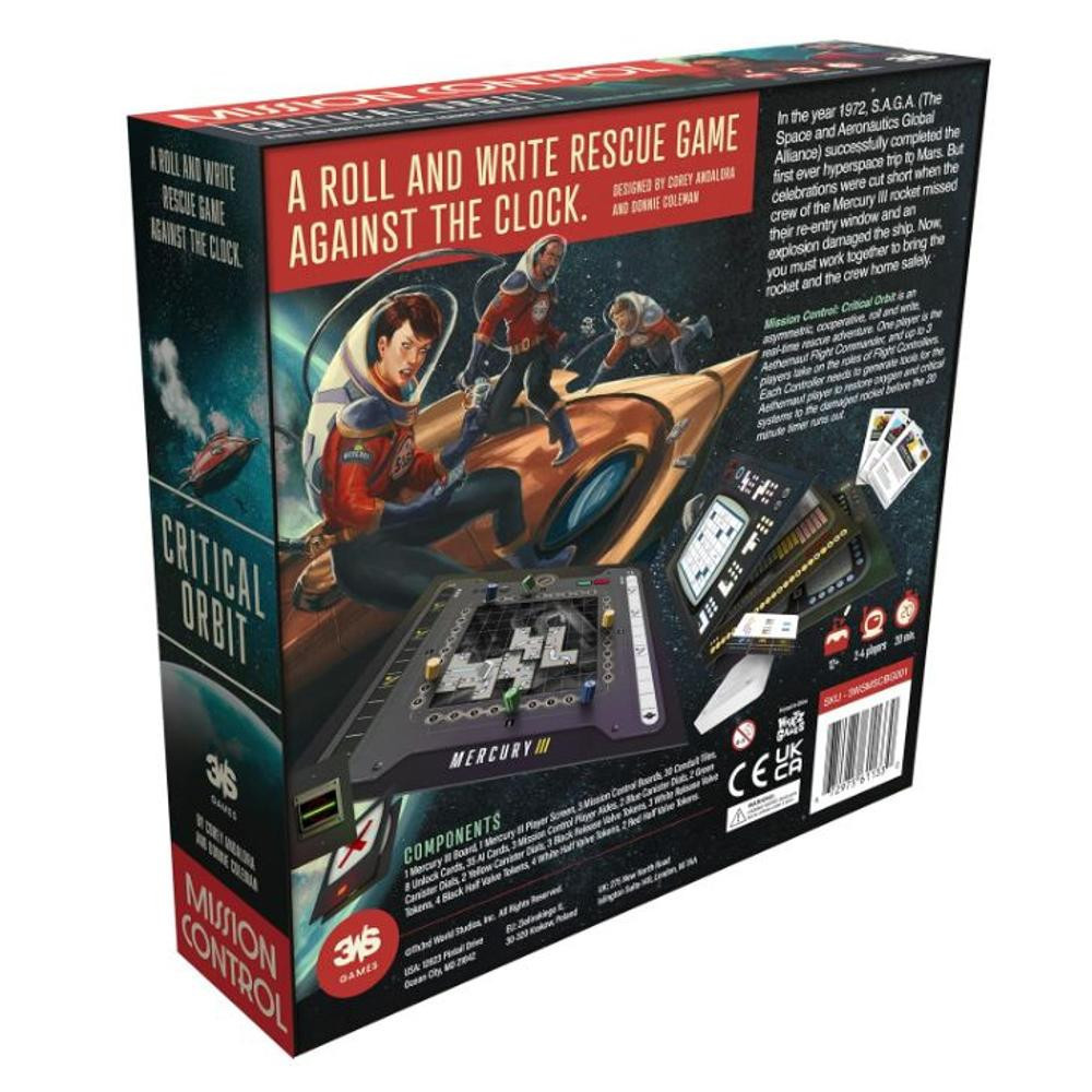 1972-ben a SAGA sikeresen eljutott a Marsra, de a visszaút nem várt kihívásokat hozott. A Mercury 3 űrhajó meghibásodott, legénysége az űr foglya lett. A Mission Control: Critical Orbit társasjátékban te lehetsz az, aki megmenti őket! Az egyik játékos a Mercury III parancsnoka szerepét veszi fel, míg a többiek a földi irányító központot irányítják. A cél, hogy helyreállítsák a rakéta oxigénszintjét, és visszajuttassák az űrhajósokat a Földre a 20 perces időkereten belül. Minden körben a parancsnok kockákkal dönt a kritikus rendszerek javításáról, míg a Mission Control tagjai mérlegelik a legjobb lépéseket. Kooperatív játékmenet és azonnali döntéshozatal szükséges a sikerhez. Játékosok száma: 2-4 fő, játékidő: 15-20 perc, ajánlott életkor: 12 év felett.