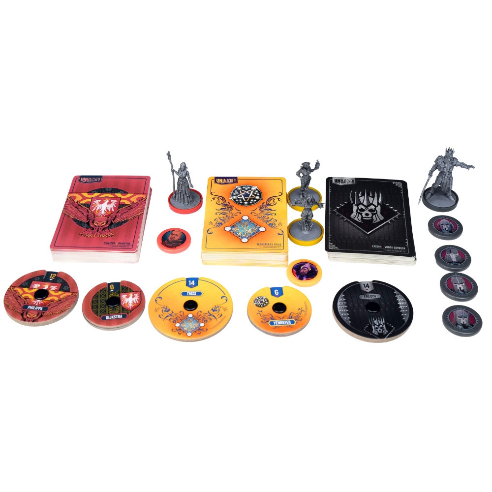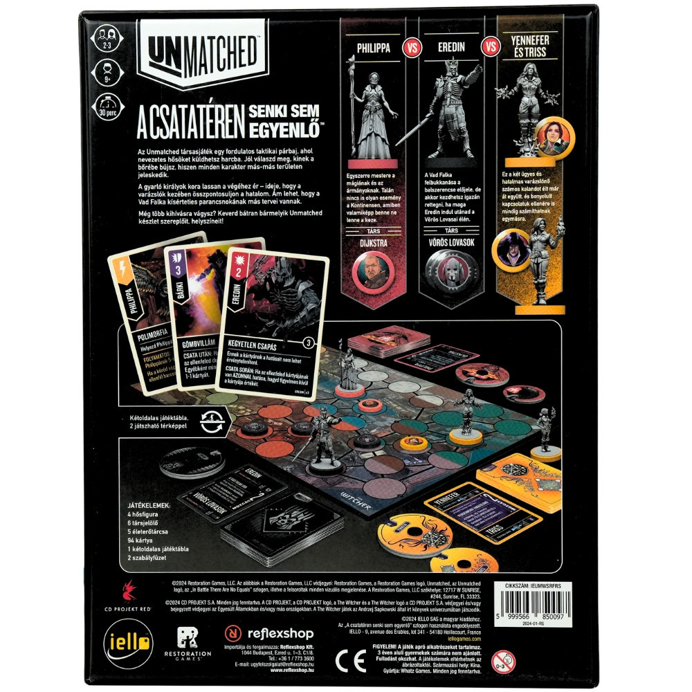 Üdv a The Witcher világában, ahol a hősök és a szörnyek egyaránt az Unmatched univerzum részévé válnak! Yennefer és Triss új játékmenetet hoznak: döntsd el, ki lesz a hős, és ki a segítőtárs, akik különböző képességeket kapnak a szerepük szerint. Philippa a ravasz varázslónő, míg Eredin a Vörös Lovasok parancsnoka, akik felbőszülnek vereségük után. A játék egy különleges játéktáblával érkezik, két eltérő csatatérrel. Válj legendás harcossá, és próbáld meg hősöd különleges képességeit a csatatéren is kamatoztatni! Képes vagy elérni a hőn áhított győzelmet?