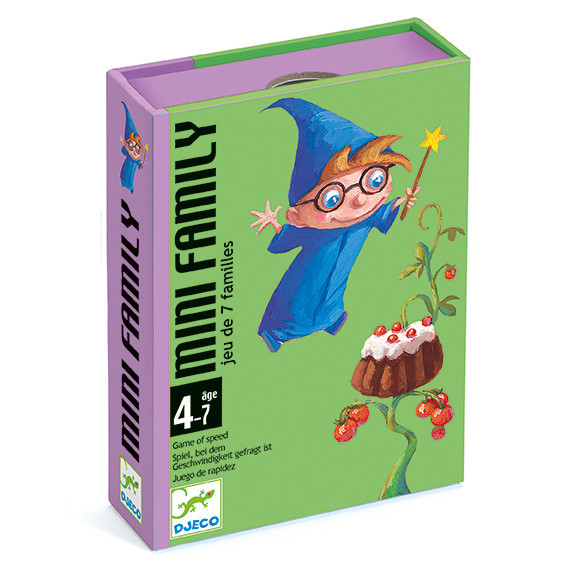 A Mini Family kártyajáték a Djeco világ fantasztikus játékai közé tartozik. A játék célja, hogy a játékosok 7 képzeletbeli család 4 tagját gyűjtsék össze társaiktól. A játékot 2-4 játékos játszhatják, és ajánlott életkoruk 4-99 év között van.