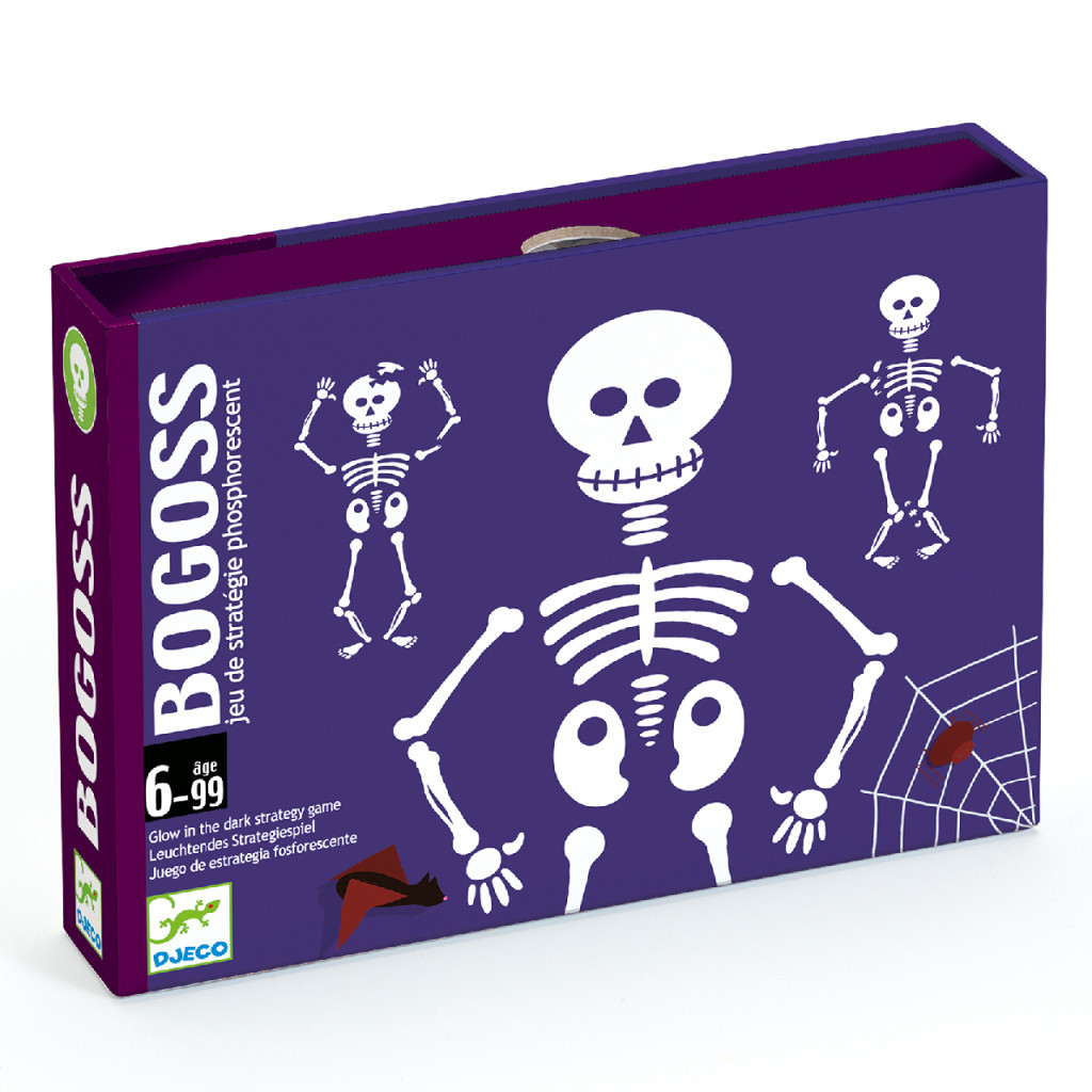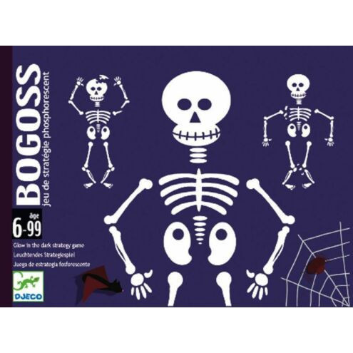 A Djeco Bogoss kártyajáték ajánlott életkora 6 és 99 év között van, és 2-4 játékos játszhatnak egyszerre. A játékhoz 44 foszforeszkáló kártyalap tartozik, amelyek közül 30 ép csontot ábrázoló kártyalap, 12 törött csontot ábrázoló kártyalap, valamint 2 Joker kártya van. A játékidő változó, és attól függ, hogy milyen gyorsan sikerül összerakni a csontvázakat.