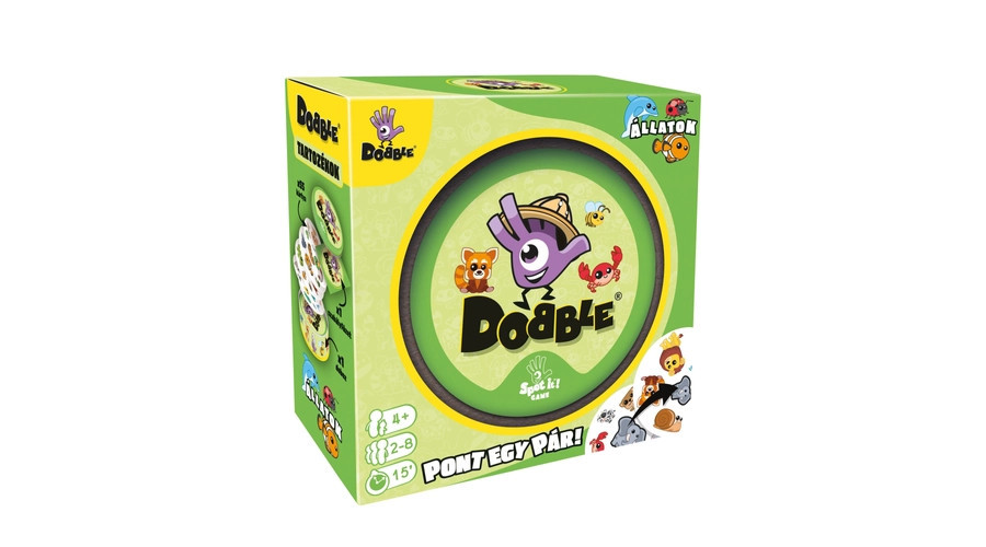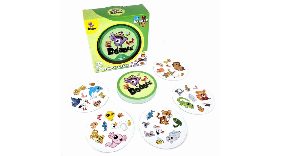 A Dobble Animals egy izgalmas gyorsasági kártyajáték 6-99 éves korig mindenki számára! A Dobble játék 55 kerek lapból áll, melyen most különböző állatok (kutya, teknős, rák, kenguru, stb.) helyezkednek el. Minden kártyalapon 8 szimbólum található, más-más elrendezésben és méretben. A Dobble Animals játék érdekessége pedig abban rejlik, hogy bármely két kártyát egymás mellé téve, lesz a kártyákon egy – de csak egy! – egyező kép. Koncentrálni kell azonban ahhoz, hogy gyorsan kiszúrjuk az egyetlen közös elemet, hiszen sokszor elvész a sok színes ábra között az, amit éppen keresünk. Amint észrevettük és hangosan kimondtuk, már el is vehetjük – vagy el is dobhatjuk – az aktuális kártyát, attól függően, melyik változatot játsszuk. A játék doboza 5 izgalmas variációt rejt, melyeket kedvünk szerint váltogathatunk. A játék remekül fejleszti a reflexeket és a megfigyelőképességet - nem utolsó sorban vidám perceket hoz a család életébe!