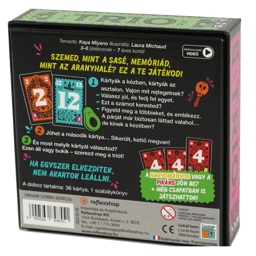 Az egyszerű és izgalmas Trio társasjáték a memóriád és a jó kérdésekkel való kihívásod tesztelésére készült. A célod az, hogy a többieknél gyorsabban gyűjts össze triókat, vagy akár a 7-es triót is megszerezz. A hagyományos módban a leggyorsabb trióvadász leszel, de van pikáns mód is, ahol 2 kapcsolt triót kell összegyűjtened, vagy csak egyszerűen a 7-es triót.