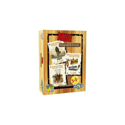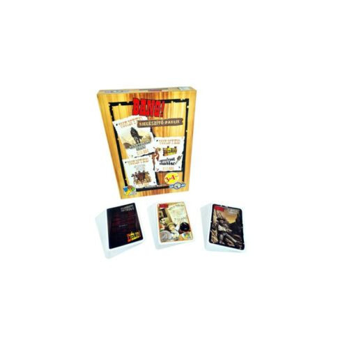 Bang! Kiegészítő paklik - Négy kiegészítő egy dobozban! Ha szereted a vadnyugati hangulatot, a revolverhősöket és a kihívásokat, akkor neked való a Bang! alapjátékhoz tartozó kiegészítő csomag. A dobozban négy kiegészítő található, amelyek még izgalmasabbá teszik a már régóta klasszikussá vált társasjátékot. A csomagban található egy Árnyak völgye nevű kiegészítő, amelyben csak a legbátrabb revolverhősök merészkednek be az árnyak völgyébe. Itt nem csak a fejvadászok, a csörgőkígyók és a tornádók veszélyesek, hanem még az ellenségeid szellemei is ott kísértenek. A vadnyugati show kiegészítőben új, erős revolverhősök jelennek meg, akik káoszt hoznak magukkal. Hihetetlen párbajok és váratlan események kavarják fel a játékélményt. Az Egy maréknyi kártya és a Délidő kiegészítők pedig új szintre emelik a küzdelmet a seriff és a banditák között. Az izgalmas eseménykártyák még nagyobb változatosságot adnak a játéknak.