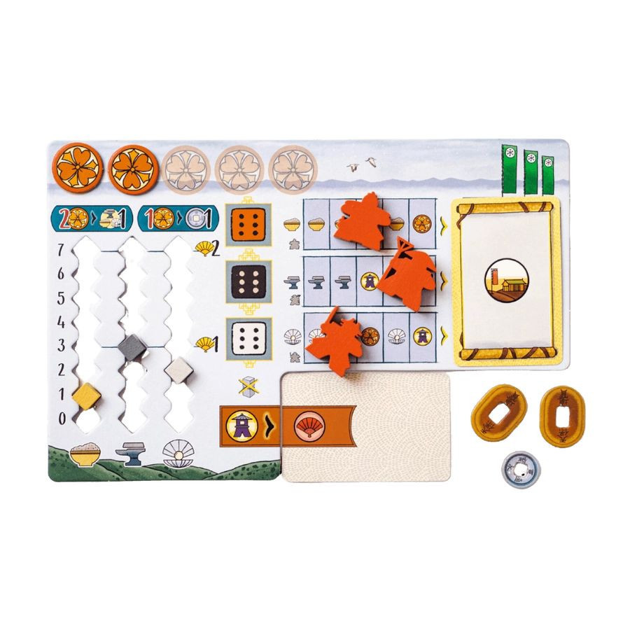 A központi panelen a Himeji kastély tárul fel minden pompájában, több zónára osztva. A legnagyobb a kastély belseje, ahol az Ezer Szőnyeg Szobájában a udvaroncoknak társadalmilag fel kell emelkedniük, hogy elnyerjék a Daimyo kegyeit. Emellett ott van a tó és a kertek, amelyeket türelmesen ápolnak a kertészek, ahol mindenki pihenhet és szabadon gyönyörködhet a szépségében. Egy másik fontos terület a fal és a kastély külső része, ahol a harcosok járőröznek és őrt állnak. Végül találjuk a három híd területét, ahol a cselekvések végrehajtásához használható háromféle kocka gyűlik össze, valamint a játékosok személyes birtokát, ahol nyomon követik erőforrásaikat és ahol a munkások tartaléka található.