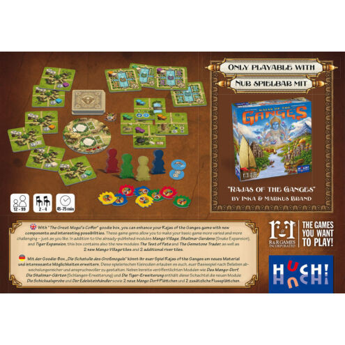 A Rajas of the Ganges: Goodie Box 1 egy fantasztikus kiegészítő a Rajas of the Ganges társasjátékhoz. Ebben a kiegészítőben található Mango Village, Tigris és Shalimar játékelemek, valamint három új modul, amelyek még élvezetesebbé teszik a játékot. A sors próbája, Gemstone Dealers és a két új folyami csempe és mangófaluk új kihívásokat és lehetőségeket kínálnak a játékosoknak.