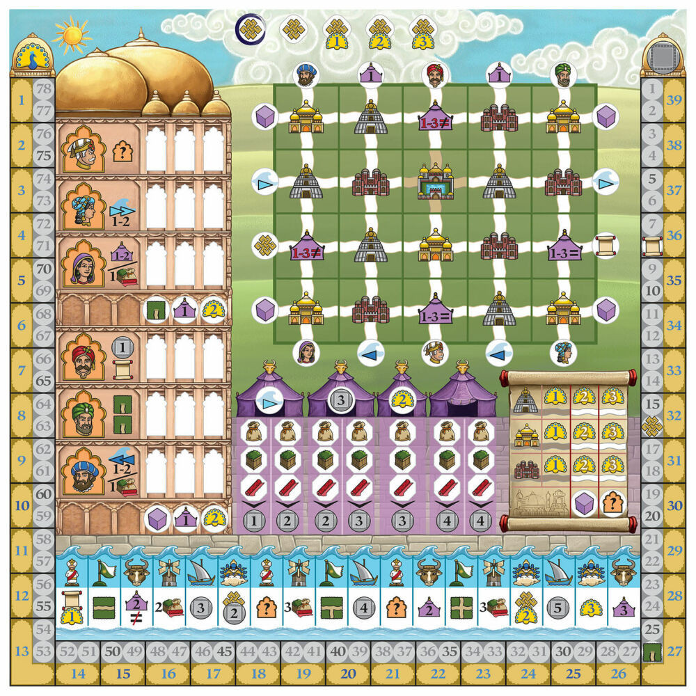Az első játékos megkapja az általa választott kocka előnyét, és bejelöli azt a pontgyűjtő lapján, majd a többi játékos választ egy kockát, és bejelöli a kapott előnyöket a lapjukon. Az első játékos jelzőjét (amelyet ugyanez az elefánt jelez) ezután átadják a következő játékosnak. A kockákkal árut szerezhetsz, árut adhatsz el, pénzt kaphatsz, hírnevet szerezhetsz, karmát kaphatsz, használhatod a palotában élő hat rádzsa karakter egyikének különleges képességét, építhetsz utat (ami más előnyöket is kiválthat), vagy mozoghatsz a folyó mentén (ami szintén előnyöket vált ki). Az eredeti játékhoz hasonlóan a gazdagságért és hírnévért folytatott versenyt zajlik. Akkor nyered meg a játékot, ha a hírnévjelződ és a pénzjelződ elsőként keresztezi egymást az ellentétes irányban futó két pályán.