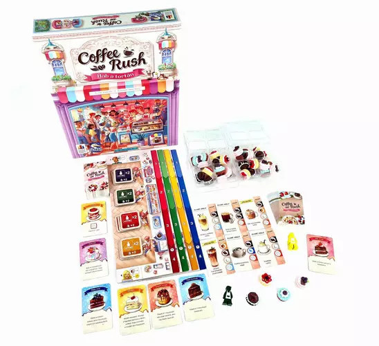 A Coffee Rush: Hab a tortán a nagy sikerű kávéházas társasjáték kiegészítője. Most már tortákkal is kedveskedhetsz vendégeidnek, így még változatosabbá téve a játékélményt. Ne feledd, szükséged lesz az alapjátékra is!